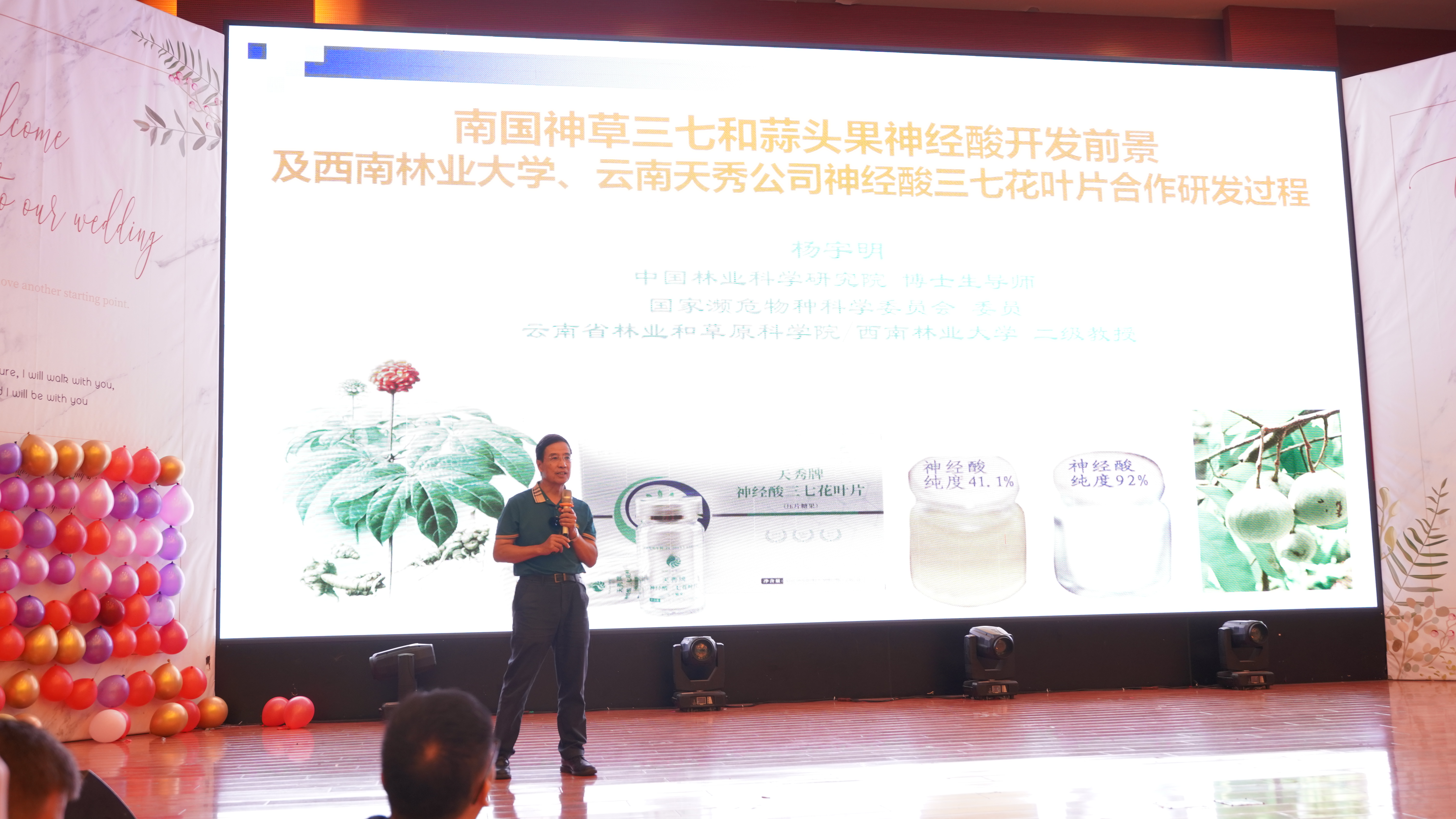 中国林业科学研究院博士生导师、国家濒危物种科学委员会委员、国家高原湿地研究中心首席科学家、云南省林业科学院原院长、西南林业大学原副院长、中国神经酸研发著名专家杨宇明教授在报告中介绍了七彩云南丰富的中药材资源情况,讲解了三七总皂苷和蒜头果神经酸对脑健康的关键作用,分享了西南林业大学和云南天秀植物公司共同研发神经酸三七产品的成果。